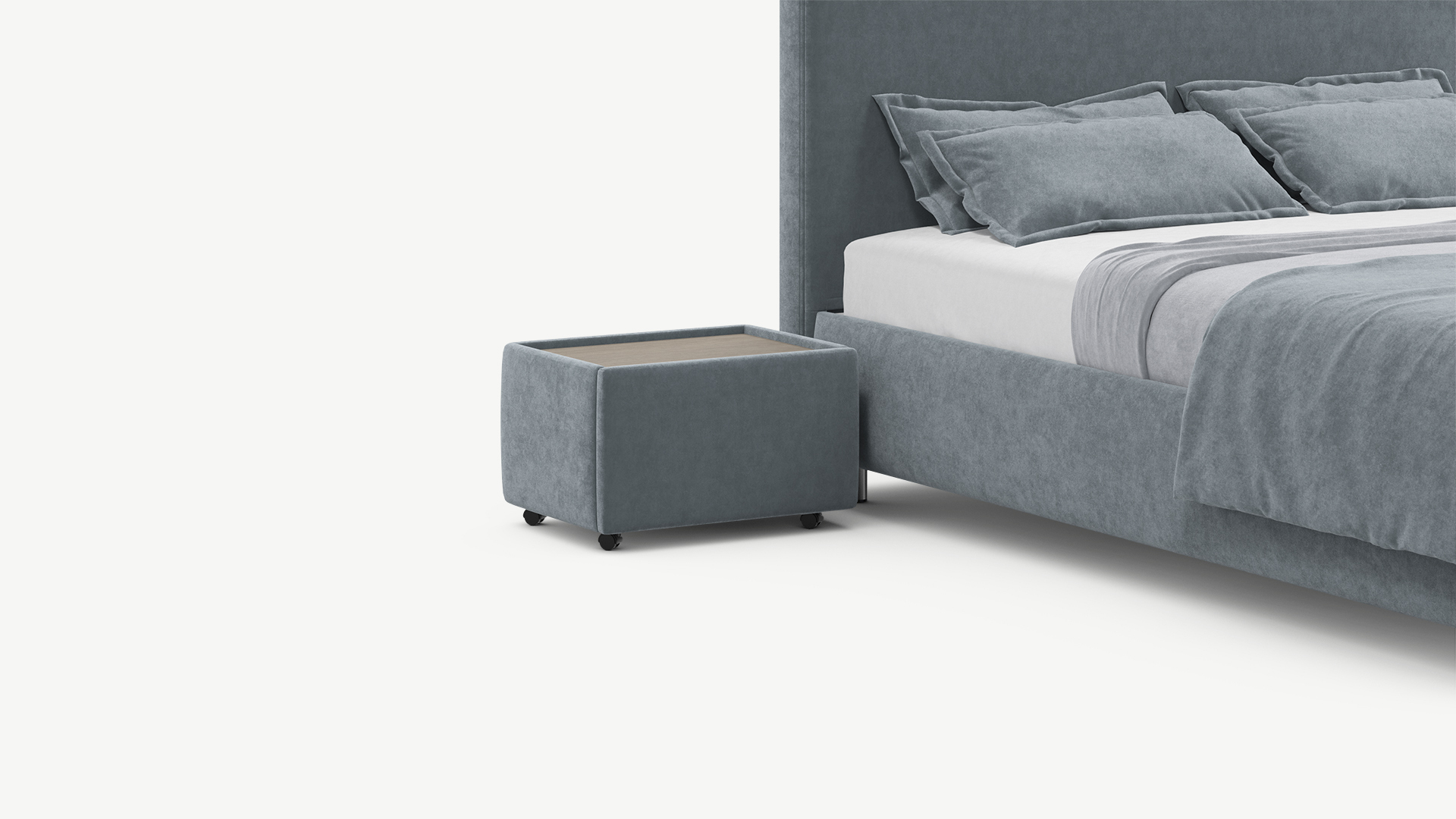 К кровати в цвет взяли две тумбы. Они мягкие, боялись, что кот воспримет как когтеточку. Но такого не случилось. Тумба вместительная, стильная, ткань не особо пачкается, но пыль садится, ее легко с ткани тряпкой убрать. Мне тумбы понравились, вместе с кроватью смотрятся миленько.