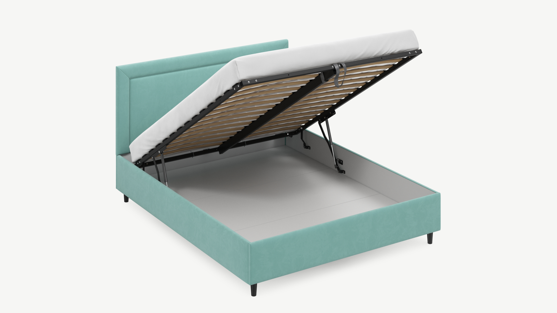 Вместительная емкость под кроватью без внутренних перегородок позволяет использовать для хранения вещей 100% пространства.