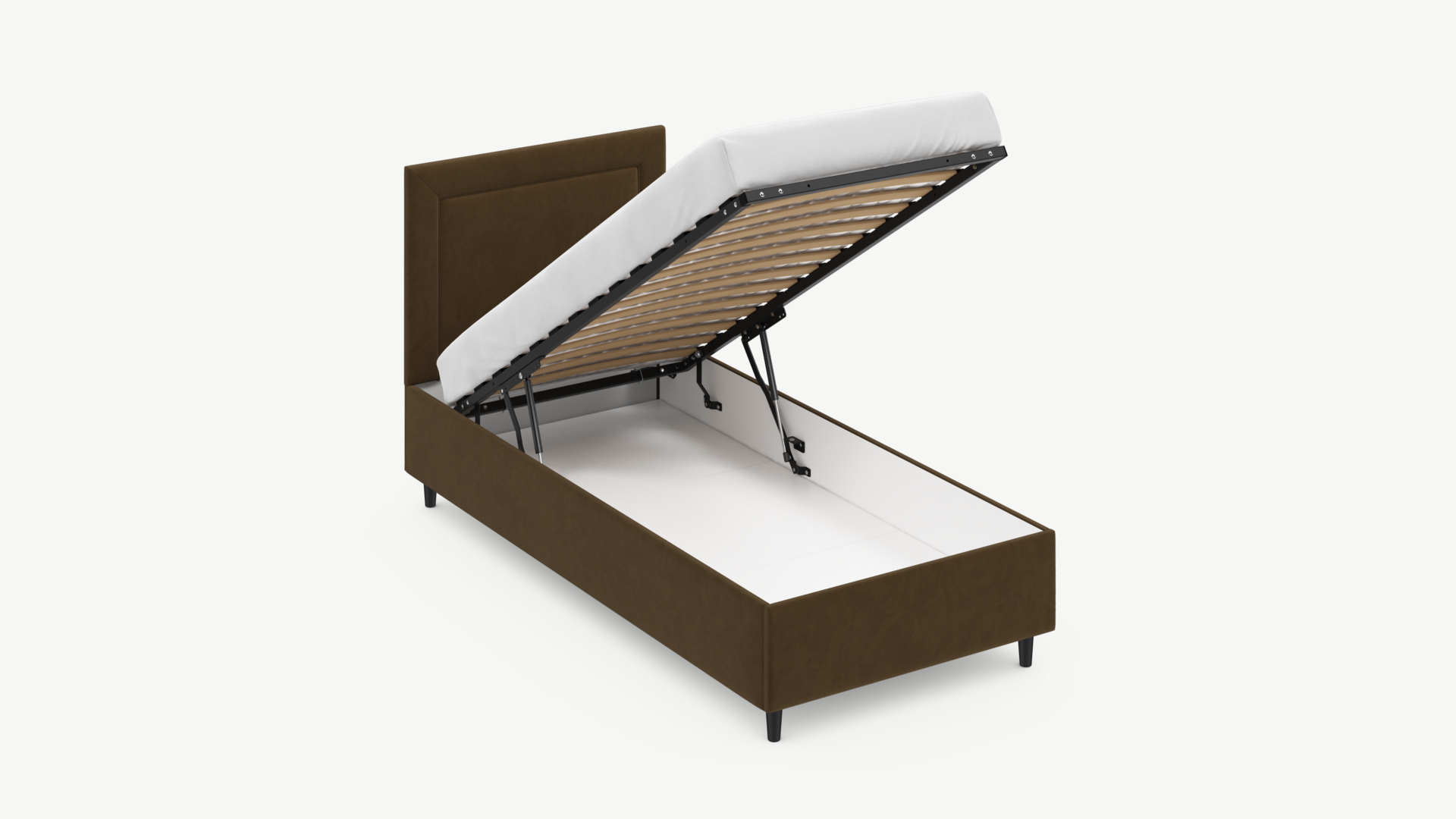 • Скрытая под основанием вместительная емкость без внутренних перегородок позволяет использовать всю площадь подкроватного пространства для хранения вещей.