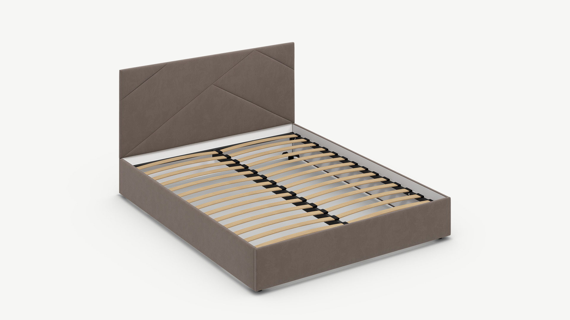 MOON FAMILY 1257 привлекает внимание оригинальным исполнением: широкие полосы ткани эффектно пересекают периметр изголовья, создавая на нем графический орнамент. Элегантным и практичным акцентом служат скрытые карманы, расположенные по его углам. Лаконичные формы объемных царг создают единый гармоничный образ и фокусируют внимание на центральном текстурном элементе кровати.