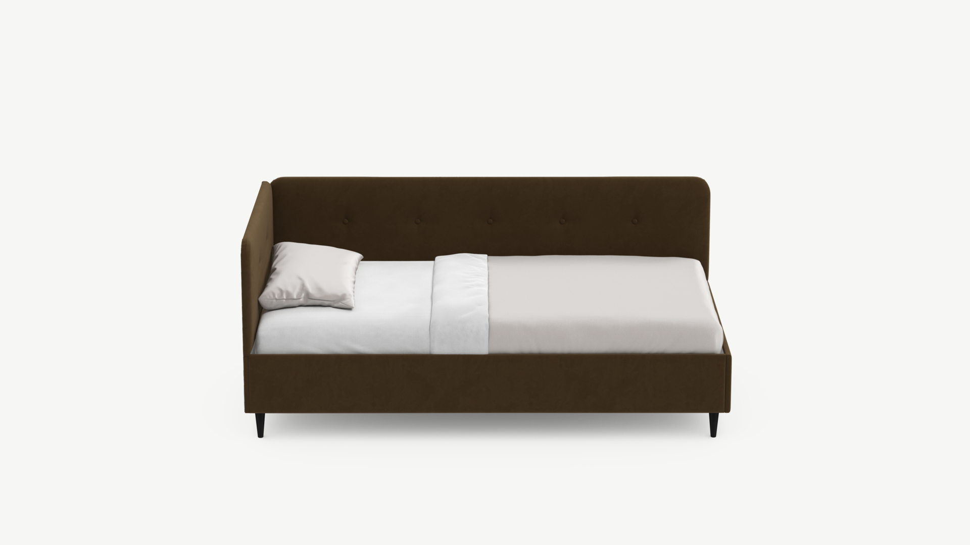 Угловая односпальная кровать MOON FAMILY 1253 с мягкой спинкой и изголовьем обладает округлыми формами, привносящими в интерьер нотки нежности. Изголовье, украшенное пуговицами, добавляет окружающему пространству шарм и уют. Высокие опоры придают кровати визуальной легкости, а также обеспечивают удобство во время уборки.