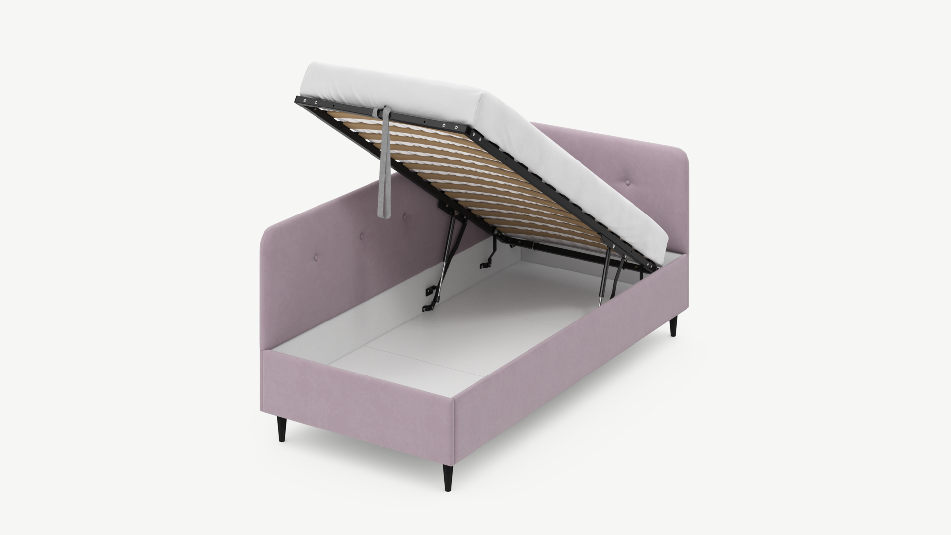 • Скрытая под основанием вместительная емкость без внутренних перегородок позволяет использовать всю площадь подкроватного пространства для хранения вещей.
